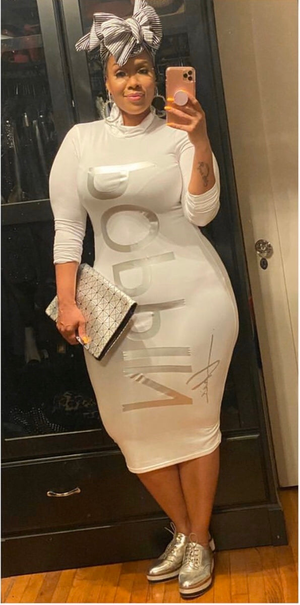 First Model is wearing a size X-Large. The dress is White with Silver Logo.