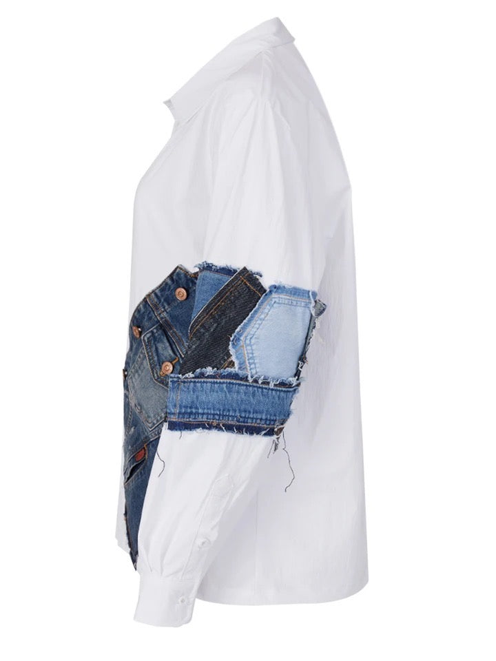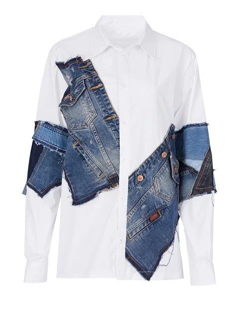 The Gabbie Denim Patchwork Collared Shirt is a timeless classic. Durable denim is stitched into a stylish patchwork detail, making it perfect for any occasion. The white collared button shirt completes the modern look and provides a comfortable fit.