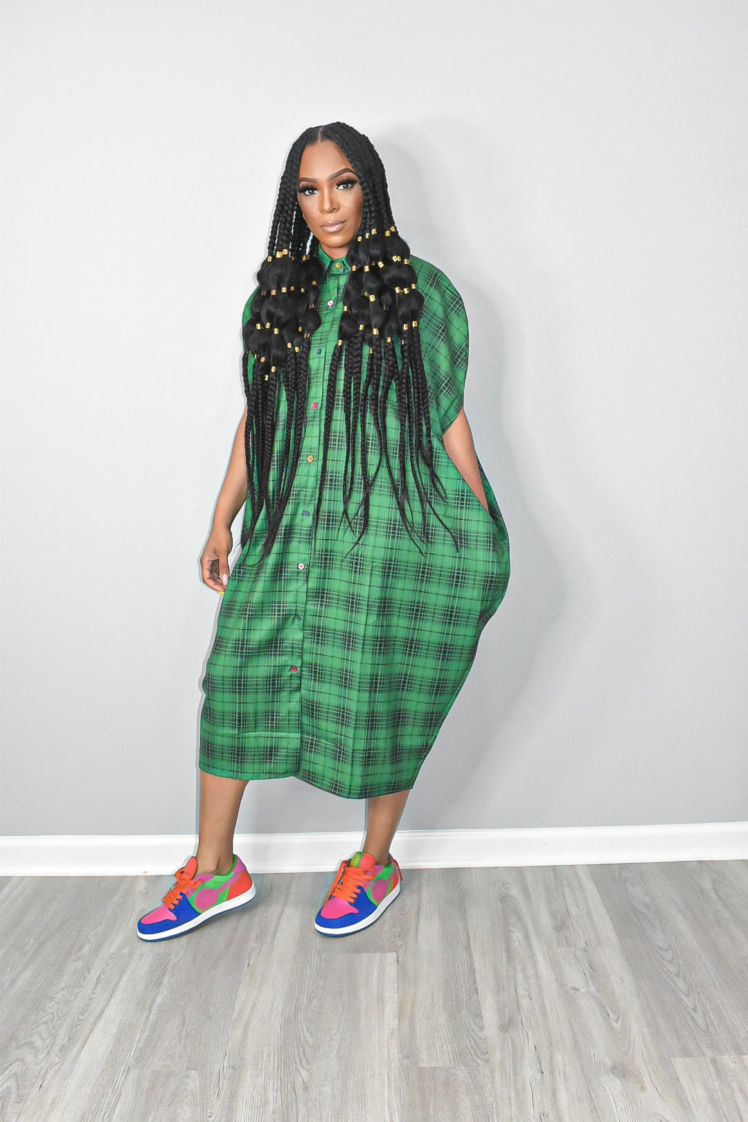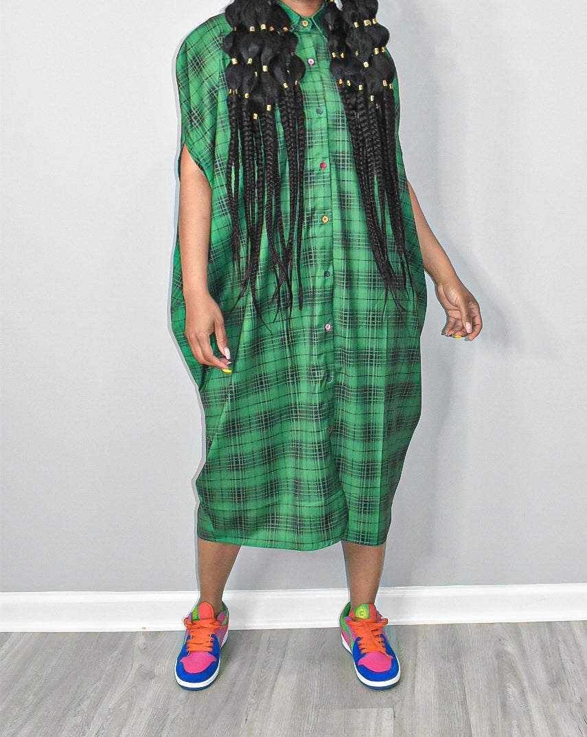 This Paula Plaid Cape Dress is the perfect addition to your wardrobe. The plaid pattern is timeless and stylish. Finishing off the look are featured colorful buttons and pockets. You will be sure to turn heads with this dress.